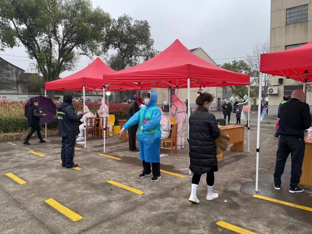 當天,是全鎮做核酸檢測的日子,黨員們帶著N95口罩,口袋里還放一小瓶消毒酒精,來到了鎮政府的核酸采集點,每位志愿者、黨員干部紛紛忙碌著,進大門的每一個人,志愿者都要檢查健康碼是否是綠色的,然后再測量體溫。一共有兩個通道,其中一個是愛心通道,老人和小孩都可以從愛心通道通過。排隊的人都留了一米遠的間隔,那是安全距離,防止病毒攜帶者交叉感染。公司黨員不顧淋著雨,口中重復著:這邊排隊,一米安全距離,打開健康碼,戴好口罩……