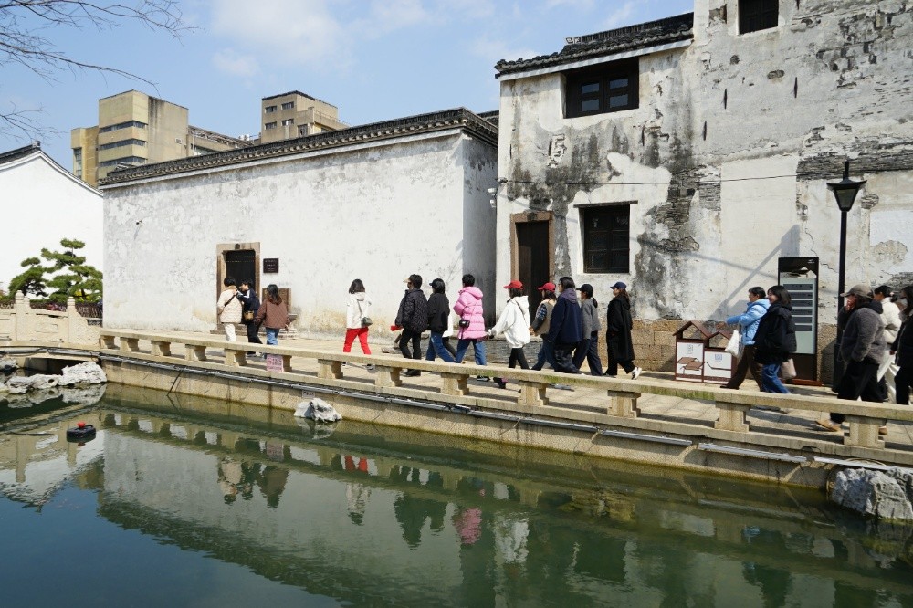 步履輕盈如行云流水,魅力綻放似春風拂柳。下午1點半,大家相約在中絲三廠文創園集合,隨后沿著塘河一路往北,來到干河街歷史街區,參觀徐志摩故居。