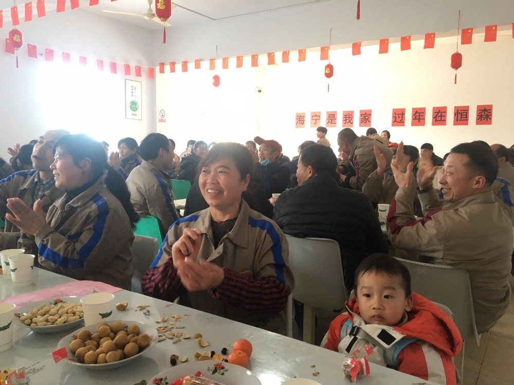 一片歡聲笑語(yǔ)中員工紛紛到來(lái),有序簽到入場(chǎng),明亮的餐廳,公司管理層早已布置,準(zhǔn)備好了整齊干凈的桌椅,掛起大紅燈籠,拉起了曖心的字語(yǔ),備了瓜子、花生、糖果等各種小食。待大家入座后,首先公司負(fù)責(zé)人李林虎表達(dá)了對(duì)到來(lái)的留廠員工的感謝。隨后一個(gè)有趣的互動(dòng)小游戲正式拉開(kāi)了茶話會(huì)的序幕,輕松歡快的氛圍中,李總帶大家回顧了2020年公司的經(jīng)歷,分享了所取得的成績(jī),并希望大家在新一年的工作中共同努力把恒森打造成充滿溫暖、互助友愛(ài)的大家庭。員工們邊吃邊聊邊表演著自己的拿手節(jié)目,相互拉著家常和探討著新的一年中要怎樣為公司的發(fā)展貢獻(xiàn)自己的力量,現(xiàn)場(chǎng)氣氛熱火朝天。一首《相親相愛(ài)的一家人》唱出了所有在會(huì)人的心聲,公司李總還親自為員工送上了新春祝福、慰問(wèn)品和曖心紅包。他們紛紛表示:海寧是我家,過(guò)年在恒森,雖距家千里但也能感受到了家的溫暖。此次活動(dòng)在大家洋溢著幸福笑臉的大合影中拉上帷幕。